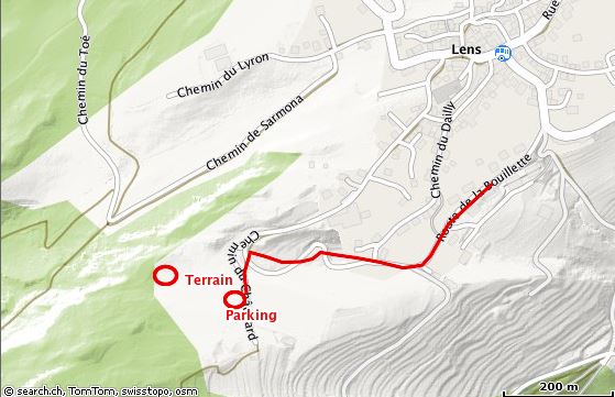 Sortie Autoroute Sierre-Ouest, suivre les indications "Crans-Montana". Après le village de Chermignon-d'en-Bas, au rond-point, suivre la direction Crans-Lens. En arrivant au village, prendre direction Granges-Lens et suivre les indications "Statue du Christ Roi / EMS du Christ Roi". Au centre du village, prendre la direction Granges-Flanthey (route en face de la poste) et suivre toujours les mêmes indications (EMS…). Vers le stand de tir, prendre la route de la Bouillette et monter jusqu'au terrain de foot du FC Lens. Notre terrain est situé à l'extrémité Ouest de la place de parc du FC Lens.